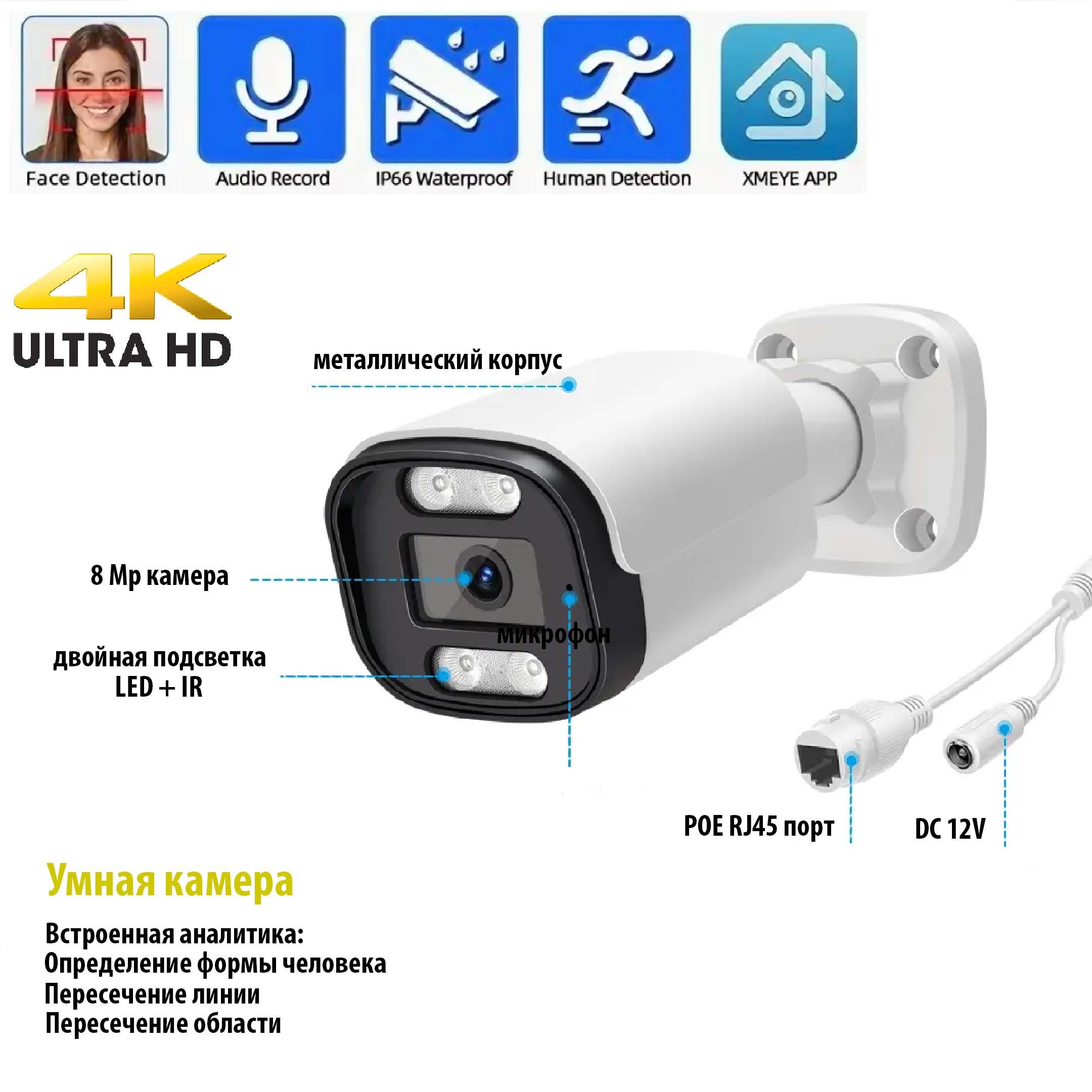 Уличная IP камера 8 Мп 4К имеет питание POE и 12В.
