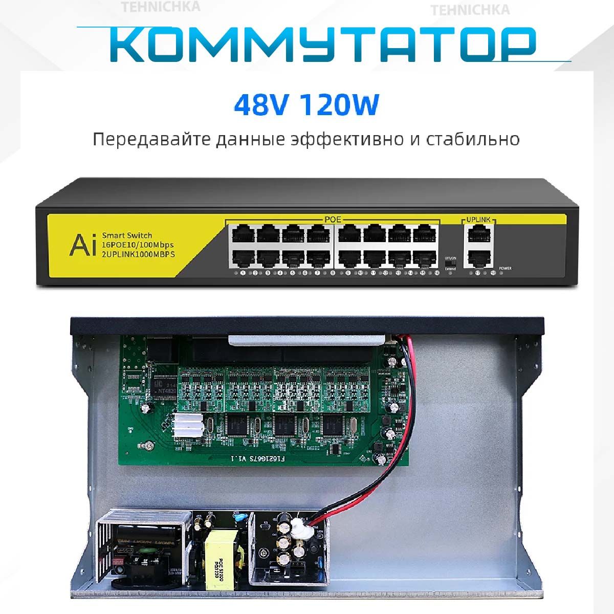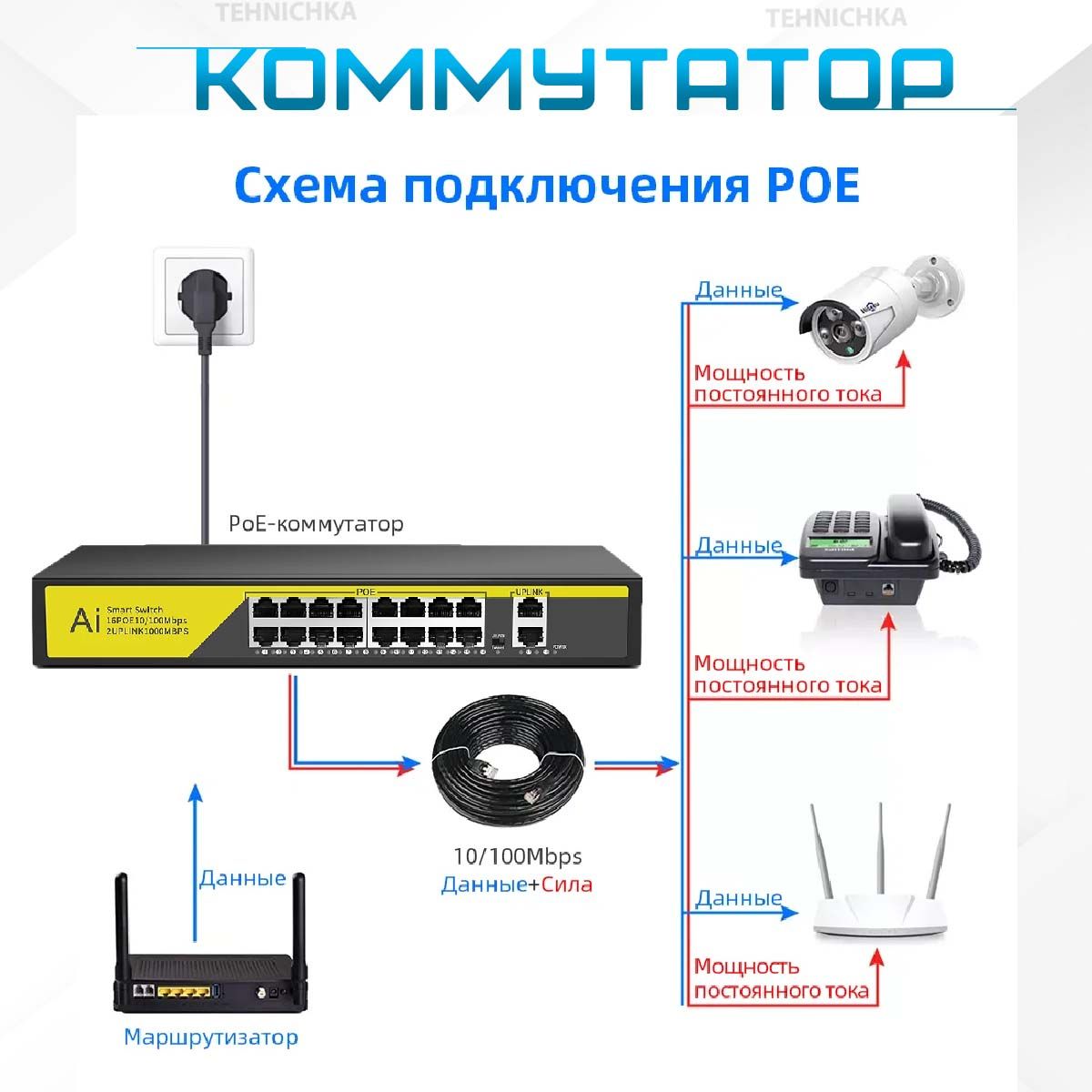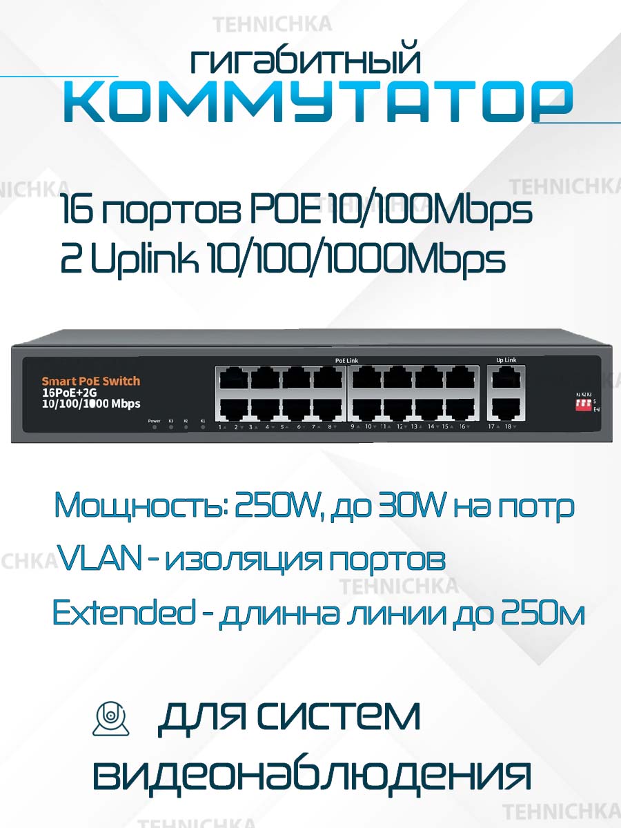 PoE-порты соответствуют стандартам IEEE802.3af/at/bt. Так же поддерживается способ передачи данных и питания по 2 (Метод А, передача питания и данных осуществляется по одним и тем же проводам (контакты 1, 2, 3 и 6 в разъёме).). Каждый порт подает питание мощностью до 30 Вт на сетевое оборудование. Это позволяет размещать оборудование в труднодоступных местах вне зависимости от расположения электрических розеток и минимизировать прокладку кабеля. Максимальная дальность подключения оборудования составляет 250 метров. Коммутатор имеет переключатель Extended, В этом режиме включается VLAN, длинна линии да до 250м скорость составляет до 10Мбит/с.