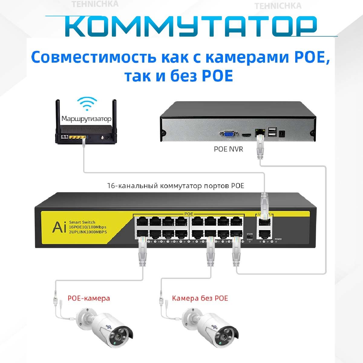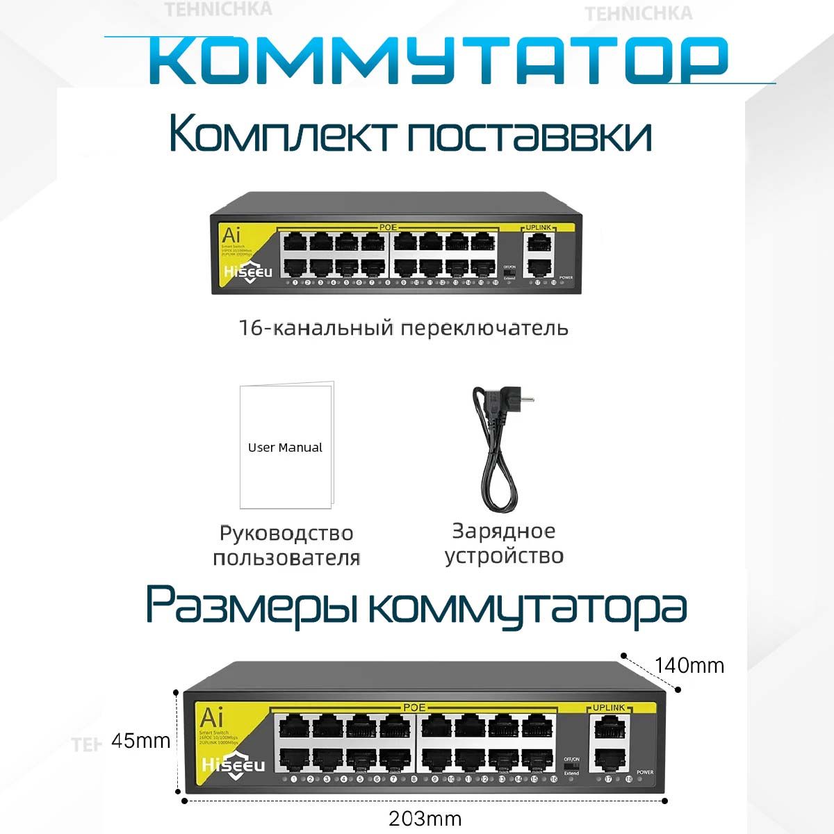Предусмотрен 2 порта RJ-45 Uplink со скоростью передачи данных 1000 Мбит/с для подключения коммутатора к локальной сети, сети интернет, видеорегистратору или другому коммутатору.