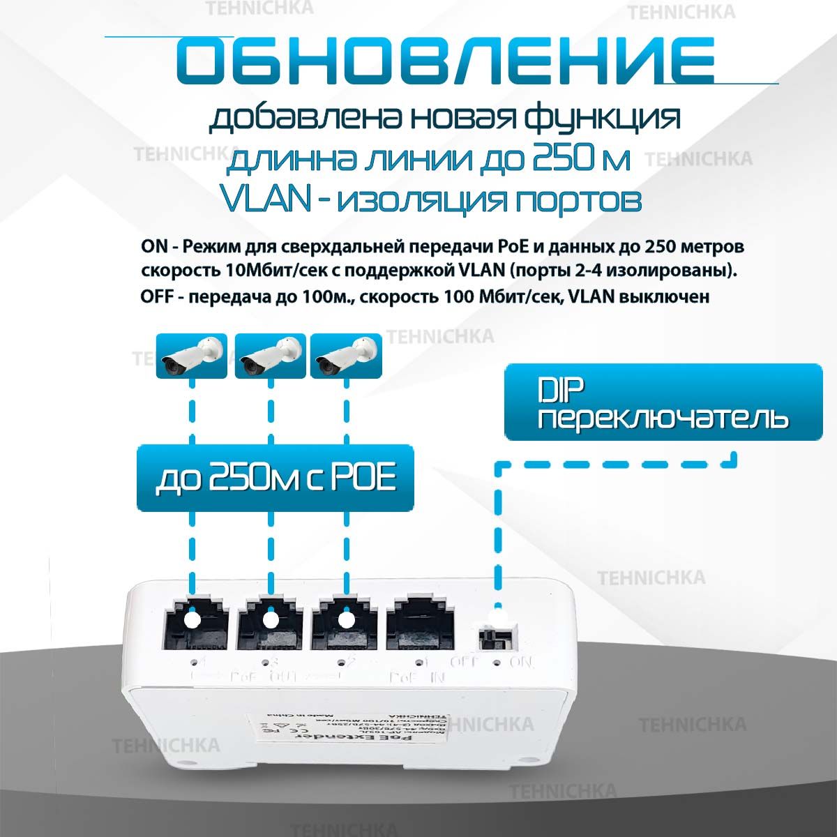 ON - Режим для сверхдальней передачи PoE и данных до 250 метров, скорость 10Мбит/сек с поддержкой VLAN (порты 2-4 изолированы).