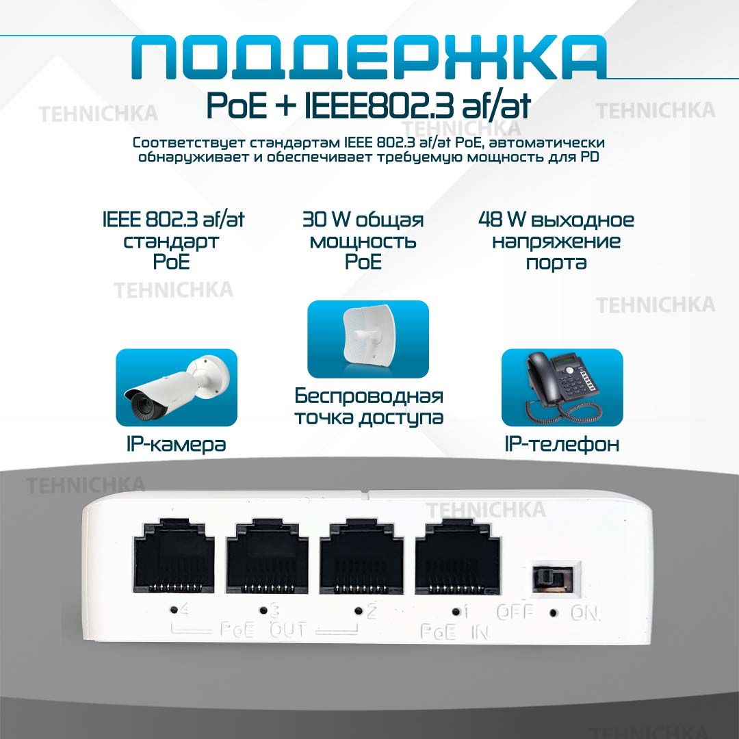 Автоматически обнаруживает и защищает оборудование PoE от повреждения при неправильной установке;