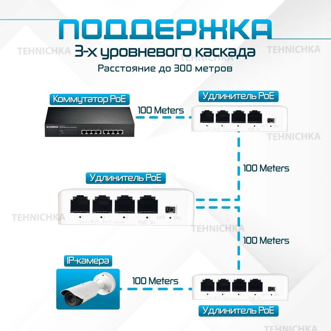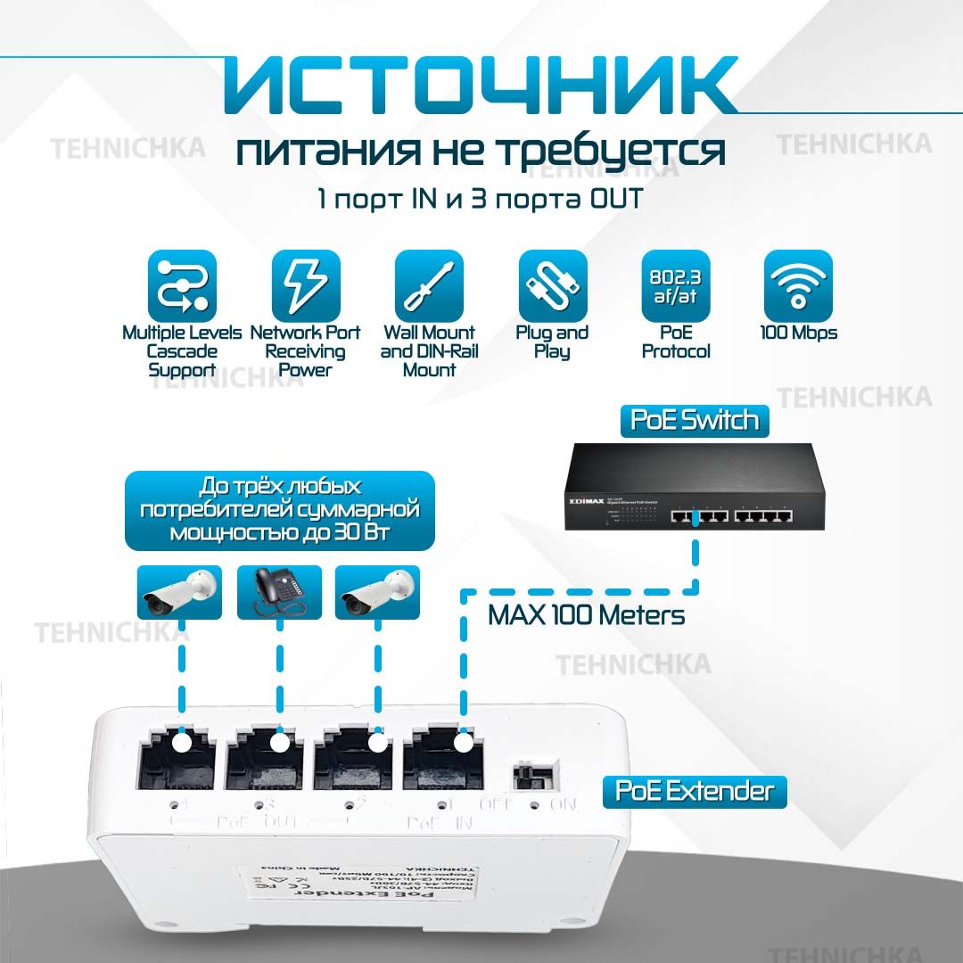 POE Extender - удлинитель разветвитель 4-х портовый. Используя данный POE удлинитель длина трассы может быть увеличена в несколько раз. Данный удлинитель устанавливается на расстоянии до 100 метров от источника POE и передает его на расстояние до 100 ( в режиме VLAN до 250) метров. С его помощью вы можете на 1 кабель подключить до 3-х PoE видеокамер или других устройств. Возможно каскадное подключение удлинителей.